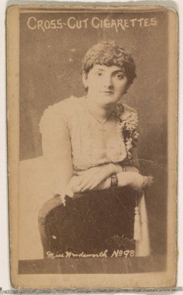 Editor: We’re looking at a gelatin-silver print titled "Lulu Burdette," dating from the 1890s. It was produced by W. Duke, Sons & Co. What strikes me most is the overall tonal softness, how the creamy whites blend almost seamlessly into the beige background. What do you see in terms of its composition? Curator: The photograph, being a gelatin-silver print, reveals much about the process and materiality itself. The near-monochromatic palette emphasizes the subtle variations in tone. The formal qualities reveal a hierarchy; Lulu’s face draws attention and softly juxtaposes against the lace, and ultimately is harmonized with the background through tone, even as its subject and composition suggest otherwise. How do you respond to that tension? Editor: I find it creates a delicate balance, preventing the image from feeling too static or flat, despite the limited color palette. So, the interplay between the flatness of the print and the illusion of depth, achieved through tonal variations, adds to its visual interest? Curator: Precisely. Note how the textural details of her lace dress and fan are rendered through a network of fine lines and shadows. Observe also the delicate contrast achieved using gelatin on silver; what could you suppose is being represented through the photographic medium itself? Editor: I see. It is not only representing an actress, it's offering a perspective of societal ideas through its construction. It's like the photograph itself performs femininity, almost as Lulu Burdette does as an actress. That adds another layer of meaning that I hadn't considered before. Curator: Indeed, that’s an astute observation. We should continue in order to elaborate these structural relationships between subject, process and form!