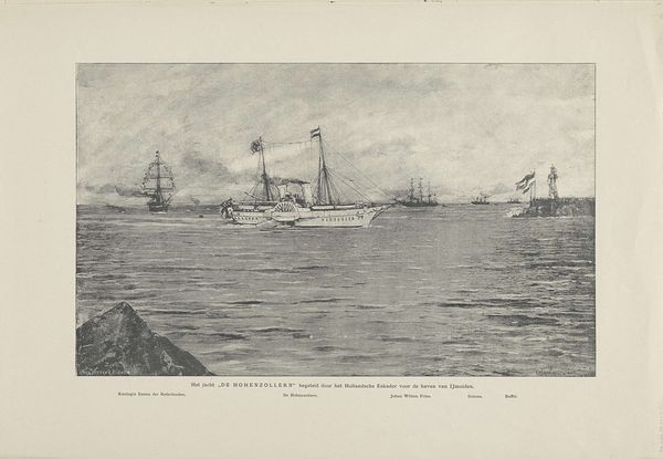 Editor: We're looking at "Overwinning op Palembang, 1821," a lithograph print created sometime between 1853 and 1861. It’s an image teeming with ships and the hazy atmosphere of battle. What compositional elements stand out to you? Curator: Primarily, I'm struck by the visual tension created through the artist's use of receding space. Note how the meticulously rendered ships and figures in the foreground contrast with the ambiguous forms obscured by smoke further back. Consider, too, the arrangement of these shapes, creating a distinct sense of depth. Editor: It almost feels unbalanced. The left side of the image is much busier than the right. Curator: Precisely. That asymmetry activates the surface, preventing the eye from settling. One must examine the interplay between line and void, darkness and light to decipher the relationships within. Do you notice how the lines in the foreground are sharper, while shapes become more amorphous as they recede into the background? Editor: I see it now. The smoke blurs everything in the distance. It creates a real sense of chaos. It is like there's structure within this visual representation of a complex historical moment. Curator: Exactly. The work’s meaning lies in the push and pull between order and disorder. Its very form embodies conflict. What impact does this have on you as a viewer? Editor: I’m beginning to understand how the formal qualities communicate the overall sense of victory. Curator: Indeed. We observe here how the artist strategically guides our experience using calculated arrangements and visual rhetoric. Form is never neutral.