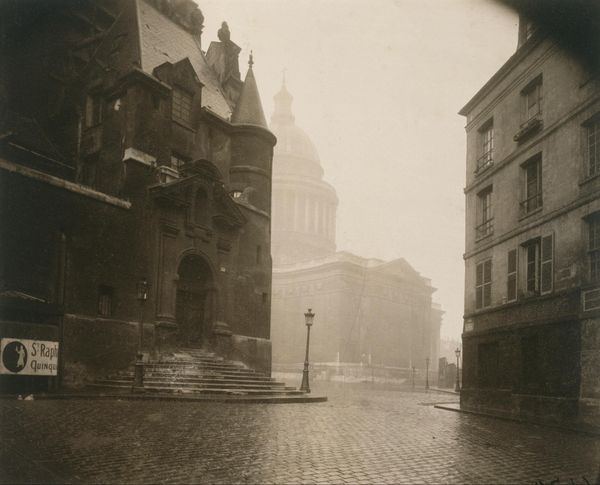 Curator: I find this gelatin-silver print, "Straatgezicht in Rotterdam," thought to be captured by George Hendrik Breitner sometime between 1890 and 1910, utterly captivating. The Rijksmuseum holds this atmospheric work. What's your first take? Editor: It's immediately evocative, almost painterly in its grays and whites. The high contrast and grain lend it a real sense of immediacy. The composition guides your eye along that glistening street into the fog. Curator: Indeed. Breitner was known for his street photography documenting everyday life in Amsterdam and Rotterdam. This image offers a window into the urban experience of the late 19th century, particularly the societal changes brought about by industrialization and urbanization. Editor: I'm drawn to how Breitner plays with light. Look how the street seems to dissolve into the background—an effect achieved not only through contrast but also by allowing the street to occupy much of the image frame. Curator: He adopted a deliberately “low art” subject, moving photography away from staged portraits and history painting. Photography at this time sought to demonstrate its capacity to realistically capture all of life's moments. His unflinching look at modern life brought a social realism that had previously been restricted within painting. Editor: There’s almost a tension, however, between realism and something more abstract. He does introduce subtle patterns: for example, the facades of the buildings, or in the direction that people walk into a sort of vaporous and diffuse tonality. I’m sensing there may be more than straight photography at play. Curator: It certainly isn't impartial observation, and maybe not entirely unlike other social realists. I read that he purposefully kept his distance with those that he photographed, maintaining social difference. Editor: Considering Breitner's aesthetic and historical choices has been fascinating. This singular print manages to synthesize impressionistic technique and critical observation into a lasting visual experience. Curator: Precisely! This photograph showcases not only Breitner's mastery of the medium but also the dynamism and gritty realism that came to define a period of momentous social transformation in Dutch society.