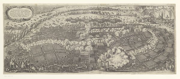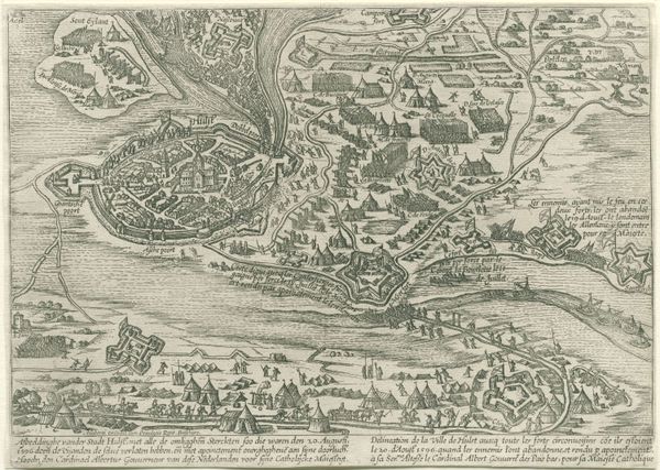 Editor: We're looking at "Ontzet van Knodsenburg, 1591," a pen and ink drawing attributed to Bartholomeus Willemsz. Dolendo, created sometime between 1600 and 1651. It's incredibly detailed! It’s hard to wrap my head around all these figures, it’s as if it's a birds eye view on organized chaos, depicting some military encounter. What can you tell me about this piece? Curator: This drawing serves as a potent visual record deeply embedded within the political and religious turmoil of its time. Consider the Eighty Years' War, a struggle for Dutch independence from Spanish rule. Dolendo’s rendering of the siege isn’t merely a depiction of military tactics; it reflects a broader narrative of national identity, resistance, and liberation from oppression. How might the precise detail, the near obsessive accounting of troops and terrain, contribute to a certain construction of historical "truth"? Editor: It's like a meticulously planned battle map. The clarity with which he depicts the city fortifications and troop formations seems intended to legitimize and commemorate Dutch military prowess, pushing some agenda maybe. Curator: Precisely. Notice the geographical markers – cities labelled by their place. Think about this in terms of territorial claims and emerging national borders. How do you interpret the relationship between cartography and power within this historical context? Is the drawing a celebration of a military victory or the inscription of dominance? Moreover, this work enters into dialogue with artistic conventions of the Northern Renaissance while simultaneously engaging in the propaganda strategies of the time. It prompts us to question the ways in which historical narratives are constructed and disseminated through visual media. Editor: It makes you think about how images shape our understanding of conflicts and nationhood, even centuries later. I will definitely think about art through a new lens from now on! Curator: Indeed. It's crucial to remember art operates within complex socio-political landscapes, and by exploring its multiple layers, we gain deeper insight into the dynamics of power and representation.