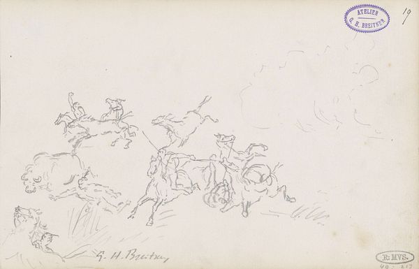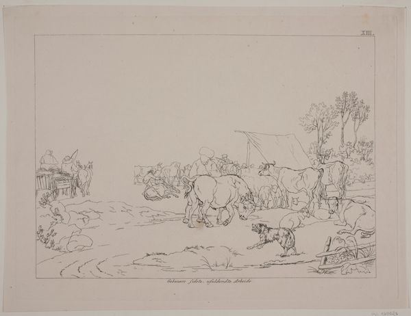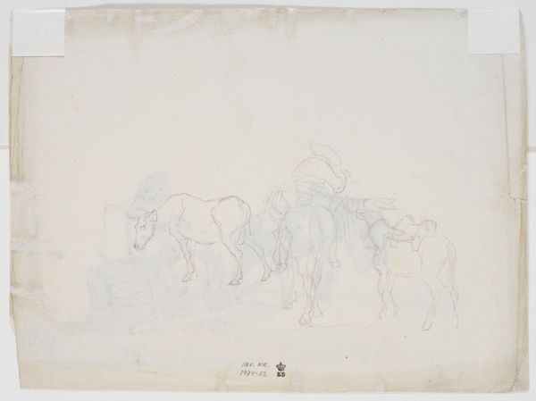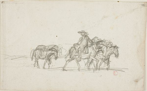 Curator: This is Johan Thomas Lundbye’s “Ploven vender,” or “The Plough Turns,” an ink drawing from 1847, now held at the SMK. Editor: It’s remarkably sparse, almost ghostly. The lines are so fine, creating a delicate, somewhat melancholic scene of rural life. The horses appear to be dissolving into the landscape itself. Curator: Lundbye was a key figure in the Danish Golden Age, very interested in depicting the Danish landscape and folk life as authentic expressions of national identity. This work speaks to the romanticized view of the rural idyll during a period of significant social and political change. Editor: I find the horses particularly fascinating. There are two, and the artist suggests that their combined symbolic value may allude to some traditional notions. Could these harnessed horses carry symbolic links to concepts like diligence and duty, crucial for national pride, even though Denmark faced a period of transition at that point in time? Curator: It's a possible argument, but I see the image functioning more directly to romanticize labour. Rural work was a topic which at that time was at odds with growing industrialization and urbanization. Remember, that these idyllic pictures mask the labor reality of peasants at the time. Editor: Indeed, and perhaps the lack of color adds to the almost ethereal quality, removing it from the dirt and toil. What about the positioning of the plowman, his gaze? What might this convey? Curator: That is the detail of the sketch that really stands out; that placid, almost neutral, gaze directing the team forward, he embodies both an ideal of diligent, modest labor, and is evocative of Danish farmers during a very troubled time for Danish nationality. The elite class wanted such scenes, while life realities for many folks would have been totally different. Editor: It truly seems to encapsulate a yearning for a simpler, perhaps imagined past, a potent symbol within its cultural moment. Thank you for expanding my reading of those iconic connotations. Curator: My pleasure. Examining art through history always reveals these complex interactions between representation and the societal moment.