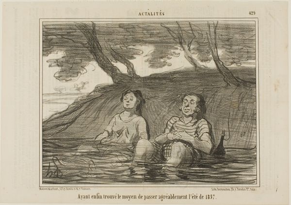 Editor: Here we have Honoré Daumier's lithograph titled "Une lecture intéressante et rafraîchissante," dating from the 19th century. It’s quite a striking image. The man seems completely absorbed in his reading while the woman next to him looks rather melancholic. What do you see in this piece? Curator: The symbolism is powerful, isn’t it? Notice how the man’s engagement is solely with the written word – a symbol of knowledge, perhaps, or societal power? And how it creates a barrier. What do you make of the figures sitting in the water? It could symbolize purification, or perhaps even the anxieties lurking beneath the surface of bourgeois life. Consider the tree, a classic romantic symbol; what’s *its* state? Editor: The tree looks a bit gnarled and worn, almost mirroring the woman's weary posture. Do you think Daumier is critiquing something specific about the relationship between men and women or about society's priorities at the time? Curator: Perhaps. It's interesting that the “interesting and refreshing reading” appears to isolate the man *from* shared experiences and the emotional landscape beside him, embodied in the woman. What lasting message do you think this image projects through time? Editor: That even simple leisure activities can reflect deeper social and personal divides. Thanks, I'll certainly be looking at Daumier differently now! Curator: Indeed. Recognizing the layers of symbolic meaning enhances our engagement and contextual understanding of art's reflection on ourselves, then and now.