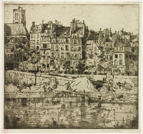 Curator: This print, titled "Filbert Street", is the work of Salvatore Pinto. Created using etching, it showcases a cityscape rendered in striking detail and line work. Editor: Whoa, this print practically sings the blues, doesn’t it? The stark contrast, all those jagged lines – it’s got a real raw, urban, almost apocalyptic feel. Curator: It's a powerful piece, depicting urban decay. I wonder what aspects of urbanism resonated with Pinto, considering this almost desolate depiction? Was he criticizing policies of development perhaps? Editor: Well, look at how Pinto renders these little figures scurrying amongst the rubble. To me they speak to resilience. Life persists. Even beauty, ironically. It’s a gritty sort of beautiful. Curator: Etching, especially line etching like this, certainly lends itself well to gritty subjects, but the choice speaks to certain values doesn't it? Prints were and in some circles still are, considered somewhat "lesser" art. Editor: Sure, sure... accessible! To be honest, there's a cinematic quality to the composition here; it's almost theatrical. A set, perhaps, for some grim drama. It's a bit much, I have to admit, for everyday life. Curator: Perhaps he was hinting at dramas and class tensions always latent within a city in the 20th Century. This sort of Realism attempts to lay bare that stage upon which such things may unfold. Editor: Maybe. Still I can't shake the image of the artist meticulously scratching away at that plate, line after line. It’s kind of obsessive, isn’t it? You can feel Pinto’s hand in it, that’s for sure. Curator: You've pointed out its intensity very well, I'm not sure, however, that "obsessive" is quite the term to apply it, as if focus can't be constructive too. Regardless, an undeniably captivating piece. Editor: True. Compelling, but not quite comforting. On that much we can agree.