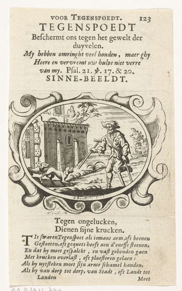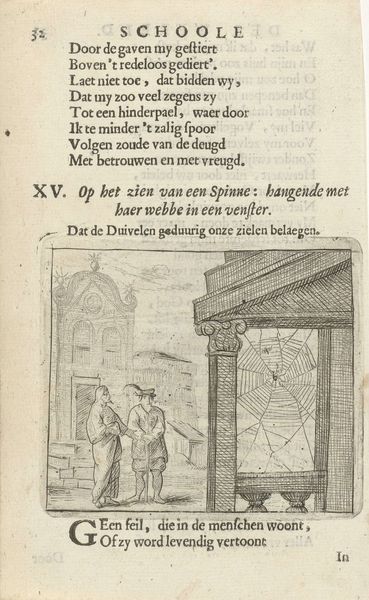 Editor: This engraving, "Two Figures by a Coffin on a Bier" by Arnold Houbraken from 1682, has a distinctly somber mood, even given the age of the work. The figures are spare, the architectural background simple but stately. The text seems central to the images' interpretation... What are your thoughts? How do you interpret this work, especially considering the societal context? Curator: It is vital to place this image within its original context. Houbraken wasn't just making art; he was participating in a visual culture deeply intertwined with moralizing and social commentary. These "school plates" weren’t merely decorative; they were integrated into the educational system. They used image and text to instruct the youth in proper conduct. Do you notice how the image sits almost directly above the text block? Editor: Yes, the connection between image and text does seem deliberate. But what's the key message here, if we analyze its components separately before bringing them together? Curator: Note the prominent display of a coffin. Death, in 17th-century Dutch art, was a common symbol reminding people of life’s fleeting nature, encouraging moral contemplation and modest living. Also consider how such readily available, reproducible art further spread ideas through education; didactics by way of popular forms of imagery. Consider what moral stance this artwork/image encourages us to embody and express. Editor: So it’s less about the artistic skill and more about its function as a teaching tool within society? That context really does shift my understanding. Curator: Precisely. The “art” exists in its deployment within the world, actively shaping social norms, expectations, and morality within an institutionalized context such as education, beyond merely art for arts' sake in the traditional art history sense. Editor: That gives me a lot to consider about how we define and interact with art in the present too. Thanks!