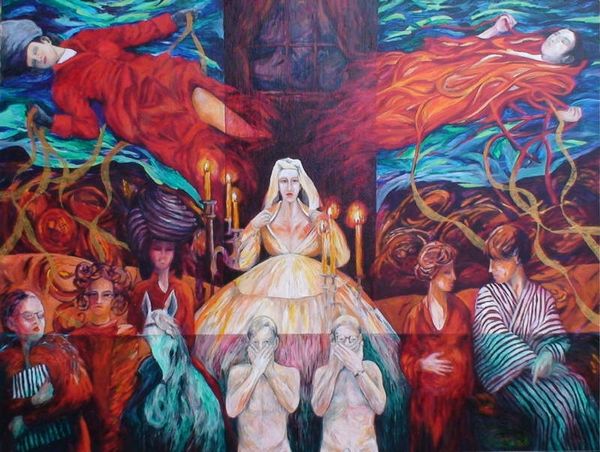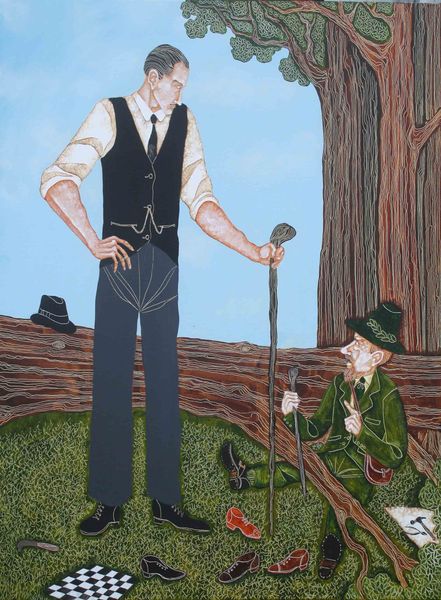 Joe Machine made "O'Carolan" using paint, and the way he applies it is pretty captivating; the colors are earthy and warm, creating an otherworldly atmosphere. I'm really drawn to how Machine builds up the surface with all this texture. You can almost feel the rough bark of the trees and the delicate petals falling from above, which gives the painting this tactile quality, like it’s something you could reach out and touch. Look at how the paint creates these intricate patterns. It's as if each mark is carefully considered, contributing to the overall feeling of the piece. This painting really makes me think of Paula Rego’s folk-inspired narratives. Like her, Machine is weaving a story with ambiguous figures, leaving us to fill in the gaps. And isn’t that what art is all about? It's an ongoing conversation across time, where ideas are exchanged, reinterpreted, and transformed.