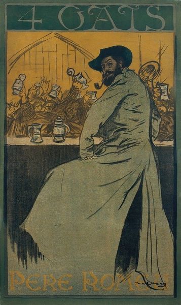 Editor: So, this is "January," a drawing made with ink by Jessie Willcox Smith in 1909. The scene appears to depict a woman sitting in a library or study hall, perhaps deep in thought. It evokes a quiet, studious mood. What's your interpretation, focusing on the composition itself? Curator: The emphasis is unmistakably on line. The artist constructs forms not primarily through shading or tonal variations, but through the confident and economic use of the line. The spatial composition is equally intriguing. Notice the interplay between positive and negative space; the background details—shelves densely packed with books—create a patterned plane against which the central figure is positioned. This flattens the space, pushing the foreground and background closer together, resulting in an overall decorative effect. Observe the color palette. Editor: It is rather limited, isn't it? Almost a monochromatic green-brown, and some whites, which feels intentional, restricting the colors... What is this achieving? Curator: Precisely. It enhances the emphasis on the forms. What is striking about these simplified colours and bold outlines is the visual harmony. Consider how the linear pattern continues, almost without interruption, throughout the plane of the picture. Editor: That’s true. I was so focused on the subject, the girl thinking and taking notes, that I didn’t realize how the line directs your eye. This creates unity... thank you. Curator: Agreed. And focusing our gaze in such manner directs and simplifies, revealing some of the structural qualities that inform our understanding of this very refined study.