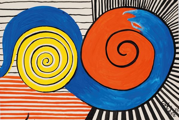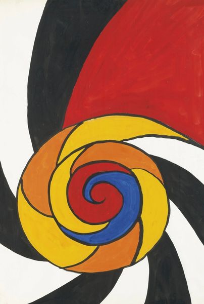 Curator: Immediately, I'm struck by the whimsy of the piece; it possesses a playful and almost decorative character. Editor: This is "Bijoux," an acrylic on painting created by Alexander Calder in 1976. Calder, of course, is renowned for his mobiles, but his paintings often get overlooked. Curator: "Bijoux"—jewels—that’s certainly suggested here. Note how the eye is led through a vibrant concentric pattern of yellow, blue, and red that radiates like the facets of a precious stone. There is a clear focal point. Editor: Absolutely. It’s interesting to view this painting within the wider context of Calder’s career. He comes to painting relatively late. And one can argue the visual vocabulary of his earlier sculptures gets translated to a new medium. Curator: Agreed, there is an interplay between form and surface here, a tension created by these graphic and almost linguistic marks contrasting against a background that gives shape, or gives 'ground' to it all. It is so typical of mid-century artistic ideas, one that is at once deeply modern but feels antique too. Editor: We also should note Calder's contribution to the war effort. The influence of naval camouflage strategies and how to avoid detection would have lasting consequences, and you see some similar concepts emerge in his more abstract approaches after that. Curator: Now, this interests me profoundly. This context does, indeed, shift my reading of the work. We can consider how forms become deflections. What did you have in mind exactly? Editor: Specifically how art and industry converged in public imagination to make everyday technology easier to trust. He was quite attuned to the politics around these efforts and was making artwork that both advanced that political objective and his own. Curator: So, from a formal point of view, the swirling shapes might represent visual obstructions or screens—an abstraction with symbolic and critical social value. It’s about decoding, in some senses, to extract information for our viewing. Editor: Exactly. It also shows his complex vision as someone who saw art and public life inextricably linked. Curator: This offers a richer appreciation of "Bijoux," a visual statement reflecting deeper socio-political dynamics. Editor: Indeed, I am reminded how seemingly simple artworks can echo complex histories, provided you are curious.