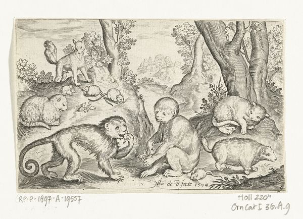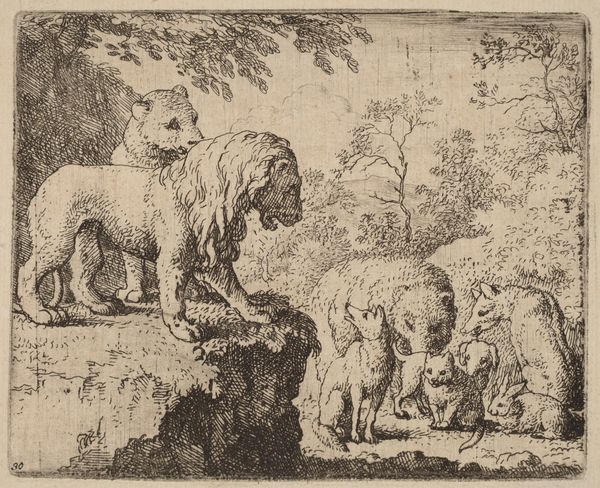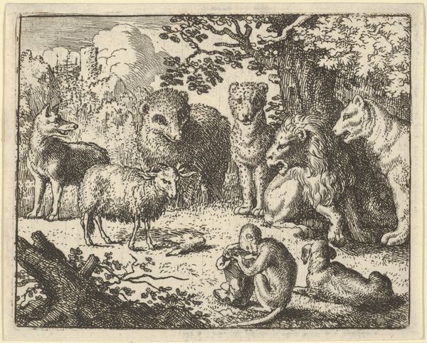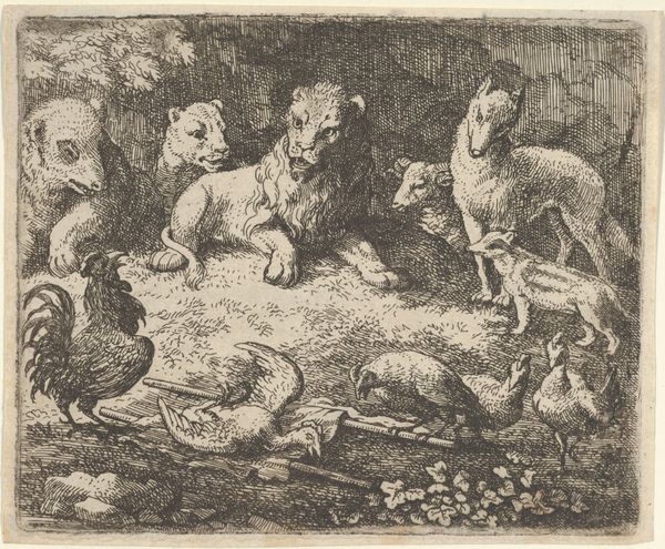 This print, "Renard Exonerates Himself of His Crimes Before the Lion," was created by Allart van Everdingen in the 17th century as an illustration for the medieval story of Reynard the Fox. It's made using etching, a printmaking technique where lines are incised into a metal plate with acid, then inked and printed. The intricate lines define the characters of the animal fable. Look closely, and you can see the varying depths and thicknesses of the lines. These marks create the illusion of light and shadow, and gives a rich texture to the scene, imbuing the animal characters with personality. Etching requires a high level of skill, combining technical knowledge with artistic ability. The process involves physical labor, from preparing the metal plate to operating the printing press. In van Everdingen's time, printmaking was an important means of disseminating images and ideas, making art accessible to a wider audience. This print then, is not just an artwork, but also a product of a specific social and economic system. It reflects the values of craft, skill, and industry.