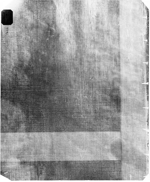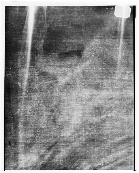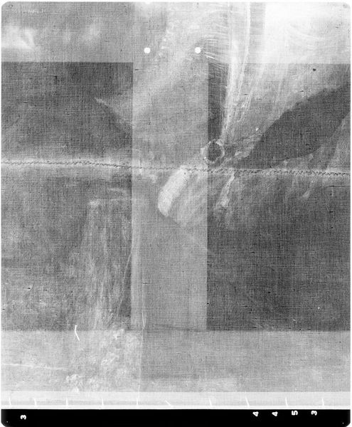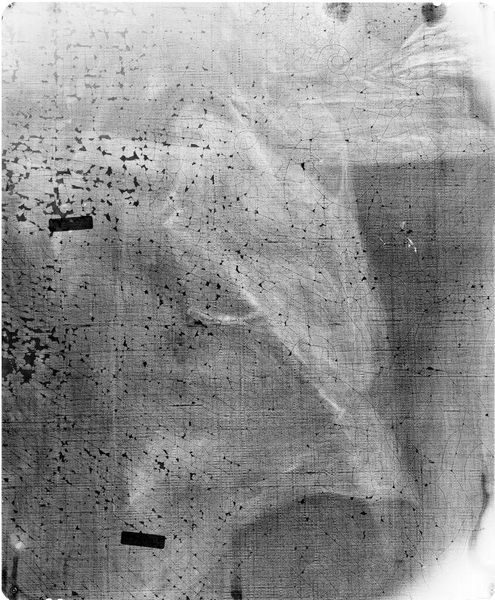 Curator: Here we have an X-radiograph of "Girl in White," originally attributed to Jacques-Louis David, held at the Harvard Art Museums. The image presents the painting's underlayers with a stark, ghostly quality. Editor: My initial reaction is that it is haunting, a visual echo of a portrait. The monochromatic palette emphasizes the fragile, almost skeletal structure beneath the surface. Curator: Indeed. The X-ray unveils David's process, the hidden architecture of his composition. We observe the stark contrast in densities, revealing areas of heavy pigment and preparatory sketches. Editor: This makes me consider issues of authenticity and artistic intention. How does our perception of "Girl in White" shift when we see this radiographic view, exposing the unseen labor and materials? It raises questions about the female subject as well. Curator: Quite so. It brings a new layer to the appreciation of artistic form and its making. Editor: It's fascinating how such a technical image can become a potent document about a woman, a process, and a moment.