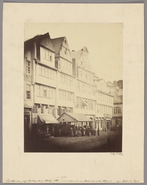 Editor: So, this albumen print, "Frankfurt am Main_ Neue Kräme," was captured around 1862 by Carl Friedrich Mylius. The detail is fascinating, you can almost feel yourself standing on that quiet street. What really strikes me is the stillness – a frozen moment in time. What catches your eye? Curator: That stillness is precisely what speaks to me too, though I hear it whisper of a before and after, a city poised. Consider, this is Frankfurt on the cusp of great change – before it becomes fully industrialized, before so much of its old architecture is lost. Do you see how Mylius uses the light? It's not just illuminating, it's almost… mourning. Editor: Mourning? I hadn't thought of that. Curator: Yes, that delicate balance of light and shadow seems to foreshadow the transformation. It almost makes the buildings feel like specters. Have you ever felt that, standing in an old city, a sense of the lives lived there, fading but still present? Editor: That’s a powerful image. I guess I was focused on the crisp details, the architecture. Now I see a story lurking beneath. What do you think he was trying to say about his city? Curator: Perhaps not so much "saying" as feeling his way through its shifting identity. Photography at that time, it wasn't just documentation. It was about capturing the soul, don't you think? Editor: Definitely something to ponder. I came in looking at buildings; now I’m seeing ghosts! Curator: Precisely! That is why I’m drawn to it - how Mylius hints at both what’s visible and invisible in a rapidly changing Frankfurt. It leaves me a sense of a story continuing outside the frame, beckoning me in.