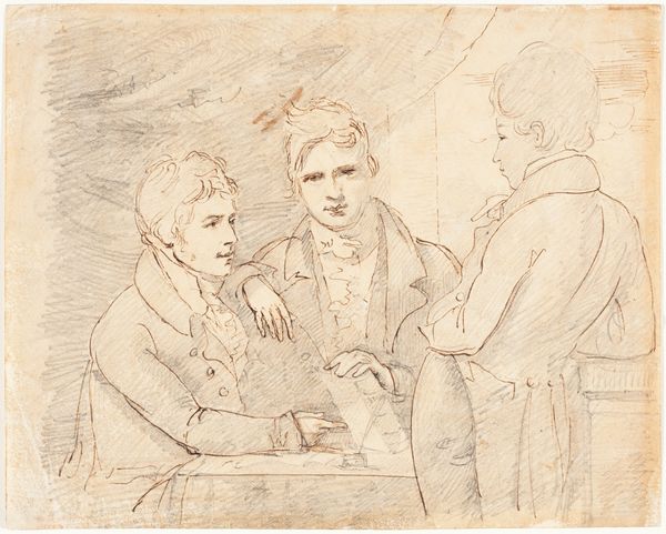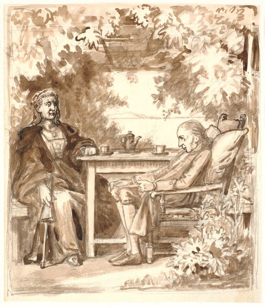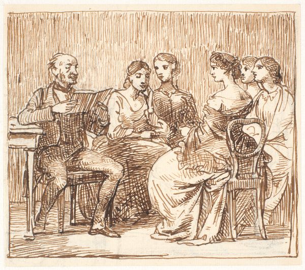 Curator: We're looking at a drawing by Wilhelm Marstrand called "An Interruption During the Meal with the Farmers," made between 1870 and 1873. The artwork now resides at the SMK, the National Gallery of Denmark. Editor: It's so understated. The sketchy quality imbues it with a feeling of spontaneity, as though we’ve just happened upon this private moment. The heavy outlines feel somewhat harsh against the soft gradations within. Curator: Indeed. Marstrand, known for his Realist paintings of everyday life, here captures a scene that seems simple, yet resonates with the broader struggles faced by agrarian communities of that period. Notice the seated man’s assertive gesture – it draws focus to questions of power dynamics. Is it an interruption, or a confrontation? Editor: It's fascinating how much narrative is packed into such a small piece, but there are certainly some things to notice! That raised hand, combined with the shared meal--the visible chalice could be symbolic--seems like he’s trying to force the couple into acknowledging him. What do you suppose that the couple might represent here, together at a table? Curator: Well, consider that depictions of peasant life at this time were rarely neutral. Often, they either romanticized rural existence or emphasized its hardships as a form of social critique. This specific drawing encapsulates the intersection of class, labour, and domesticity. Are these farmers enjoying a brief respite or facing a disruption threatening their very livelihood? I am particularly drawn to how the woman's head covering denotes status while simultaneously diminishing her individuality. Editor: Ah, interesting! Those are fantastic points. In that light, the chalice really pops. It makes one think about larger historical ideas of community celebration--of family at table together, not necessarily sharing conflict! The choice of rendering this genre-painting as a drawing heightens the intimacy while leaving many answers tantalizingly unresolved. Curator: Precisely! Marstrand makes us question the conventional interpretations of genre scenes, inviting dialogue regarding how artistic representation shapes our perception of marginalized communities. Editor: I've been particularly intrigued by how an apparently commonplace drawing could stimulate thinking regarding larger topics of culture. Thanks!