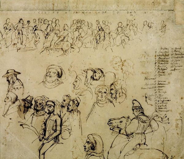 Editor: This drawing by Thomas Stothard from the Tate collection is quite intriguing. It's a jumble of faces, figures, and decorative motifs in brown ink. What do you see in this piece? Curator: I see Stothard grappling with the visual language of power and piety in 18th-century England. Consider how these faces, particularly the men in their distinctive headwear, might represent authority figures within religious or societal structures. What narratives might they be enforcing, and whom are they excluding? Editor: So, it's not just a sketch, but a potential commentary? Curator: Precisely. Even the seemingly random placement of these figures could be a deliberate disruption, questioning the established hierarchies of the time. The women in the upper left - how might their gaze challenge the male figures? Editor: I never thought about it that way; I was just seeing a collection of portraits. Curator: Art is rarely just what's on the surface; it is often a lens through which we can examine the complex social and political landscapes of the past, and reflect on those of our present.