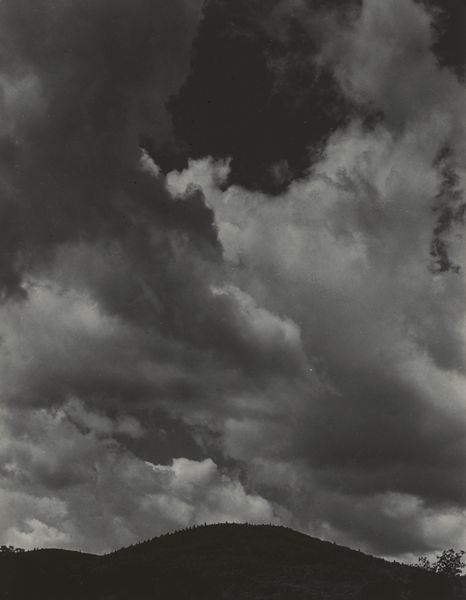 Editor: We’re looking at "Equivalent," a gelatin-silver print by Alfred Stieglitz, taken in 1926. It's predominantly clouds, dramatic and abstracted. What do you see in this piece in terms of its historical context? Curator: This image, part of Stieglitz’s “Equivalents” series, challenges the conventional understanding of photography at the time. Think about pictorialism, which emphasized the aesthetic qualities and artistic intention. He moved away from using photography to simply document reality, using the camera to explore internal states and project them onto the natural world. In what ways do you feel that approach relates to broader changes within artistic institutions in the 1920's? Editor: So, it’s less about capturing the external world and more about…personal expression? Was he responding to the rise of abstract painting at the time? Curator: Precisely. There was a tension at that moment concerning the role of art. Post World War I, many artists felt a need to express intangible, subjective realities. These photographs functioned as a commentary on art's new social and cultural function, and served as a reminder that photography could offer emotional depth similar to painting and sculpture. Does it challenge your own understanding of what a photograph should be? Editor: It does! It makes me reconsider the artistic choices involved in photography – composition, light, contrast. It’s not just pointing and shooting. Curator: Exactly. By focusing on clouds, a subject seemingly devoid of concrete meaning, Stieglitz shifted the focus towards the emotional resonance of the image itself. His use of the cloud, and the decision not to showcase what the technology could record with crystal clarity, was absolutely a bold step toward claiming artistic agency. Editor: I never thought of cloud photography as such a radical artistic statement. I will definitely think twice about how art reflects its time. Thanks. Curator: Indeed. These photos changed the status of photography and its exhibition within galleries and the wider culture, and the conversation continues.