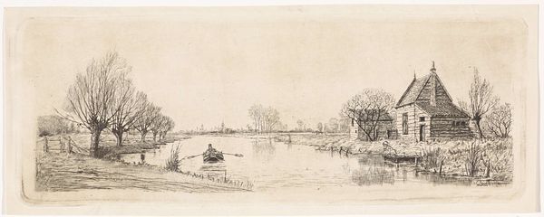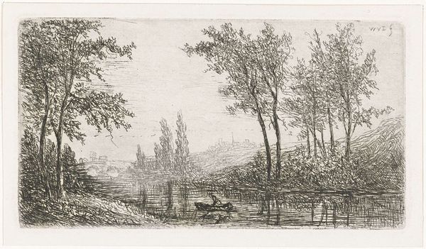 Editor: Here we have Francis Picabia’s etching, *Banks of the Loin, Saint Mammes*. The details are so fine, almost like a pencil sketch, and the light seems to shimmer on the water. What do you see in this piece? Curator: The skeletal trees reaching across the river evoke a potent sense of transition, of liminal spaces. They act as a veil, a scrim between the conscious and unconscious, a long-standing cultural symbol. Consider the presence of water too – traditionally, it reflects transformation, mirroring the visible and invisible. What might these recurring symbols of passage signify to you? Editor: That's a great question! I guess I see a stillness, but also movement—the flowing water, the bending branches… Like things are both stable and always changing. Curator: Exactly! And the figures by the riverbank seem almost like onlookers, standing at the threshold of change. Artists have long explored these symbolic thresholds. Think of the Romantic fascination with ruins, places where nature reclaims what was built, showing a cyclical sense of decay and rebirth. This image carries similar cultural memory. Editor: It’s interesting to think about symbols existing across time and reappearing in different ways. I tend to think of artists working in isolation. Curator: These motifs are persistent. The landscape is always there, available for symbolic interpretations to speak to psychological and societal transitions. Editor: I didn't expect to think about landscape as carrying that much cultural weight. Curator: Absolutely! It has made me consider the power of repeated imagery across cultural production, carrying different valences across generations. Editor: Me too, I'll never look at a river the same way.