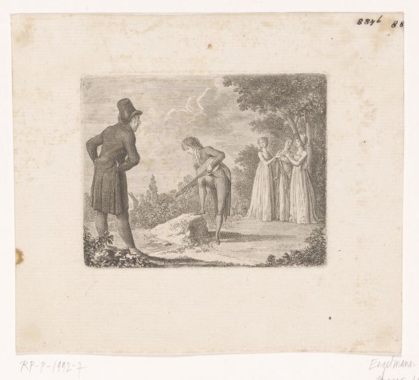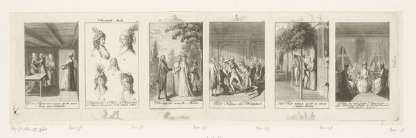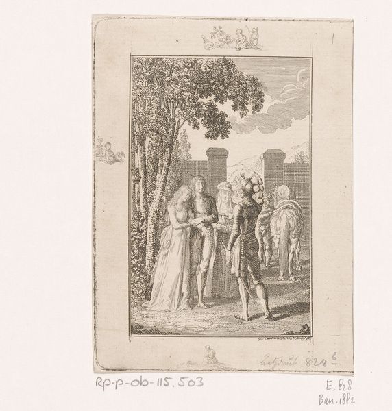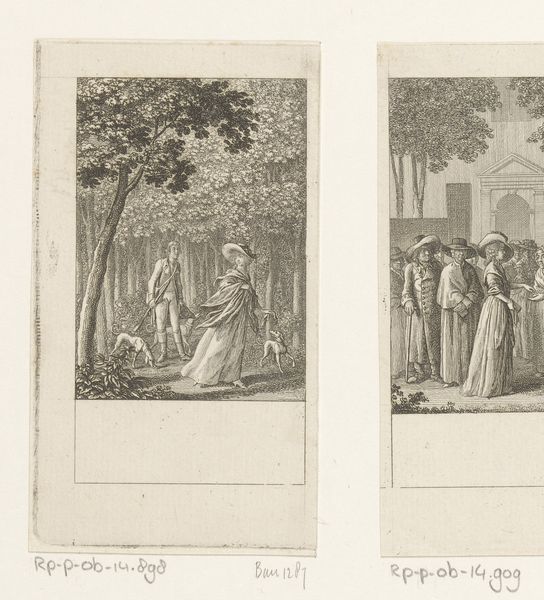 Daniel Nikolaus Chodowiecki created this print, "Twee voorstellingen uit de verhalen van Wilhelm Gottlieb Becker," using etching techniques. Notice the diptych composition, dividing the scene into two distinct yet related narratives, each framed within its own pictorial space. The left panel presents a social scene, figures arranged in a semi-circle engaging in what appears to be a formal exchange. The right panel offers a more secluded, intimate setting, with figures interacting amidst dense foliage. This contrast in spatial arrangement invites a semiotic reading. The geometry of human interaction versus the organic, free-flowing form of nature. Chodowiecki uses line and texture to define form and create depth. The hatching and cross-hatching, particularly evident in the landscape, add a layer of complexity. The balance between light and shadow enhances the narrative's emotional undertones. Consider how Chodowiecki uses formal structure to explore themes of social interaction, nature, and human relationships, inviting us to decode the visual language.