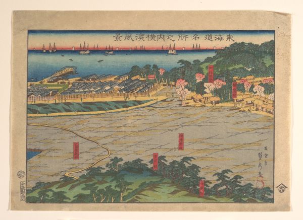 Utagawa Sadahide created this striking woodblock triptych, "Daimyo's Processions Passing along the Tōkaidō," in the 19th century. Notice how the composition is structured around the sinuous, almost calligraphic line of the road, snaking through the landscape, punctuated by the rhythmic repetition of figures in procession. This linearity is echoed in the distant horizon with the serene presence of Mount Fuji. The division of the triptych into separate panels creates a fragmented view, challenging traditional perspective. Sadahide uses color not for realistic representation, but for symbolic effect. The soft blues of the water and sky contrast with the greens of the foliage, creating a sense of depth and atmospheric perspective. This interplay of line, color, and composition destabilizes conventional landscape aesthetics, reflecting the dynamism of a society in flux, and asking us to consider how movement and change can be represented through form. The artwork remains a powerful testament to Sadahide's vision.