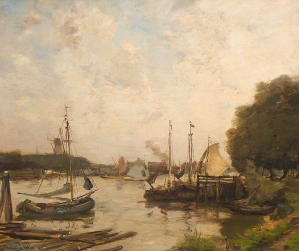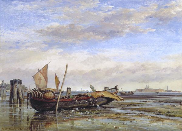Curator: Eugène Boudin’s oil painting, “Etaples, La Canache, Low Tide,” completed in 1890, is before us today. Editor: It’s evocative. That pewter sky and the ochre sands create such a quiet, melancholy mood. I find it compelling, this sense of the ordinary somehow rendered profound. Curator: Boudin, a precursor to Impressionism, was celebrated for his plein-air seascapes, focusing here on Etaples, a fishing town. Look at how the boats sit beached; consider their construction, the materials enduring relentless tides. Editor: Boats, certainly, but also vessels of deeper symbolism. Ships frequently signify journeys, transitions, the crossing over from one state to another. Here, at rest, maybe the implication is that of journeys concluded, or perhaps temporarily suspended by the ebbing tide. Curator: Absolutely, the tidal activity itself could suggest constant change impacting labour. Were those fishermen successful, returning after working the sea, what were the materials they hoped to acquire? Or were the prospects less profitable on this particular day in 1890? These social realities surely shaped the material production and trade represented here. Editor: Beyond literal goods, notice how the sails, the water itself, reflect and refract light. For me, the light suggests a kind of divine presence. These figures on the shore are engaged in a sacred ritual of sorts, bound by timeless rhythms and an awareness of something beyond themselves. Curator: These forms feel like part of a much larger system and cycles of work! But focusing only on that transcendental dimension may cause one to lose the value of this kind of study regarding a key center of marine trades. Editor: Agreed. The beauty and potency is not exclusively one of those separate dimensions alone. Curator: Ultimately it comes together. I was provoked by what this canvas suggests of the conditions that day and those for the figures onshore, while you were carried away in considering a symbolic register beyond that very same, and compelling picture. Editor: And yet we’re both deeply enriched and contemplative, prompted by Boudin’s masterful brushstrokes.