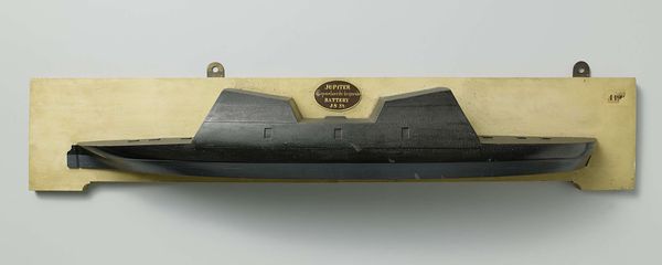 Editor: Here we have the "Half Model of a Floating Battery," created in 1867 by Rijkswerf Vlissingen, employing mixed-media, metal, and wood in its construction. I’m immediately struck by its almost brutal simplicity and the rather muted color palette. How do you interpret this work formally? Curator: Notice how the geometric forms interact; the imposing black turret-like structures are sharply contrasted by the smoothly curving hull below. The planar surfaces against the subtle roundedness. Editor: Yes, the visual language is quite stark. But beyond that contrast, is there anything else that catches your eye from a formal perspective? Curator: Observe the proportional relationships. The overwhelming horizontality. Consider also the role of the supporting structure. The backboard grounds it, emphasizing its flatness. And the plaque mounted above. Does it signify the artwork's essence? The material fact and arrangement are key here. Does the visual language suggest anything? Editor: Perhaps a tension between aggressive form and grounded stillness? I hadn't thought about the plaque’s influence. It almost formalizes the brutalist forms. I’m finding so much more nuance than I initially saw! Curator: Precisely. Attending to form can yield profound interpretations beyond mere description. I am grateful to have assisted. Editor: This exploration has provided such a clear perspective!