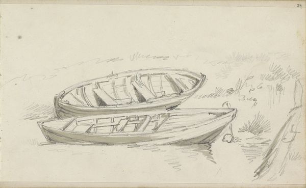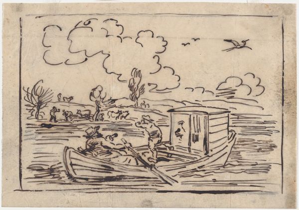 Charles-François Daubigny created this print, "Calling to Shore," using etching. The scene, rendered in delicate lines, invites contemplation through its structural balance, dividing the composition into water and sky. The eye is drawn to the boat—a dark, detailed mass—contrasted against the lighter, atmospheric background. This interplay of dark and light not only creates depth but also a visual rhythm, enhanced by the subtle textures achieved through the etching technique. Daubigny's choice of subject, the everyday life on the river, reflects a shift from academic ideals toward a more direct engagement with nature and the experiences of common people. The boat can be interpreted as a signifier of transition, linking the traditional rural life to the burgeoning modern era. The artwork destabilizes established meanings by engaging with new ways of thinking about space and perception. The print's structure embodies a formal beauty, inviting us to consider how Daubigny merges aesthetic appeal with broader cultural themes, reflecting a move toward new modes of representation and interpretation.