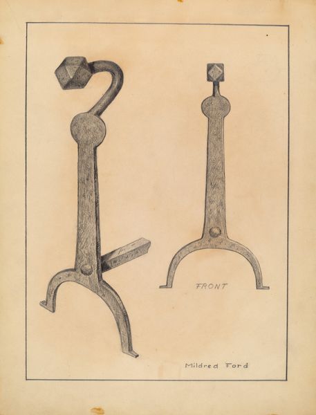 Mildred Ford rendered this drawing of an andiron, one of a pair, using graphite and colored pencil. The andiron, designed to hold burning wood in a fireplace, is depicted with precision, showcasing its utilitarian yet artistic form. Ford, born in 1855, lived through immense social and technological change. While domestic objects like the andiron might seem mundane, they were central to daily life, especially for women who often managed the household. Ford’s choice to represent this object elevates its status, inviting us to consider the value of everyday items and the labor associated with them. The andiron, typically made of iron, embodies strength and resilience, qualities that resonate with the experiences of women who navigated a patriarchal society. Ford’s meticulous rendering captures the andiron’s physical presence and hints at the stories of warmth, hearth, and home it represents. It invites us to reflect on how objects mediate our relationship to history, memory, and domestic space.
