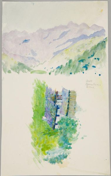 Editor: This watercolor is called "Huts on the Side of a Mountain, Serravalle, Italy," by Denman Waldo Ross. I’m really drawn to the way the washes of color create a dreamlike, almost hazy effect. What story does this painting tell, in your opinion? Curator: It's fascinating how Ross uses watercolor to depict not just a scene, but also a feeling. How do you think the choice of such a light medium, watercolor, affects our perception of the Italian landscape being represented? Editor: It definitely makes it feel less permanent, more like a fleeting moment, something captured in time. Curator: Exactly! And consider the historical context. Travel was becoming increasingly accessible. Could this be interpreted as a picturesque souvenir, reflecting the romanticism associated with the Grand Tour, but made more accessible to a burgeoning middle class? Editor: I hadn't considered it that way. It makes you wonder about the politics of whose landscape gets represented and how. Curator: Precisely. We’re not just seeing a mountain; we're seeing a carefully constructed image for a particular audience. Editor: I’ll definitely look at landscape paintings differently now.