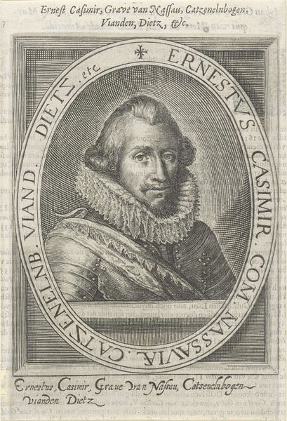 Editor: This engraving, "Portret van Frederik Hendrik, prins van Oranje," is attributed to an anonymous artist and dates to the 17th century. The intricate lines and the formality of the portrait give it a very stately, official feel. What stands out to you about this piece? Curator: I see the engraving as a strategic piece of image-making. Consider the context: the 17th century in the Dutch Republic was a time of consolidating power. Prints like this, circulated widely, were crucial in constructing a specific image of leadership. Notice how Frederik Hendrik is presented within an oval frame adorned with Latin inscriptions detailing his titles and domains. What does that framing tell you? Editor: It makes him seem very important, almost like a coin or a medal. I suppose these prints were kind of like propaganda? Curator: Exactly! Engravings offered a relatively inexpensive way to disseminate images, reaching a much broader audience than painted portraits. They helped shape public perception of Frederik Hendrik, solidifying his authority. Look at his expression - it’s carefully crafted to project strength and stability. But don't overlook the artistic skill: how does the use of line contribute to the overall effect? Editor: It's incredibly detailed, giving the impression of wealth and precision in a way that’s very convincing. It is definitely crafted to build his prestige! Curator: Precisely! It underscores how art played an active role in constructing power during this era. Considering that this piece resides in the Rijksmuseum, it serves now as a testament to that visual language of leadership from a key period in Dutch history. It's not just about the man, but the machinery of power around him. Editor: Seeing it as a tool of image-making changes everything! Thanks! Curator: It makes you consider the choices involved in constructing the narrative. I’m glad to have shared a fresh perspective!