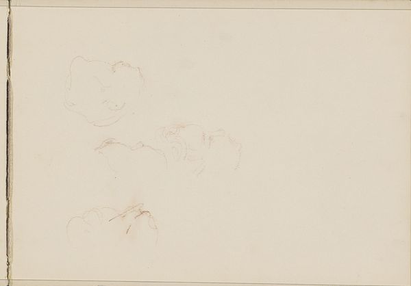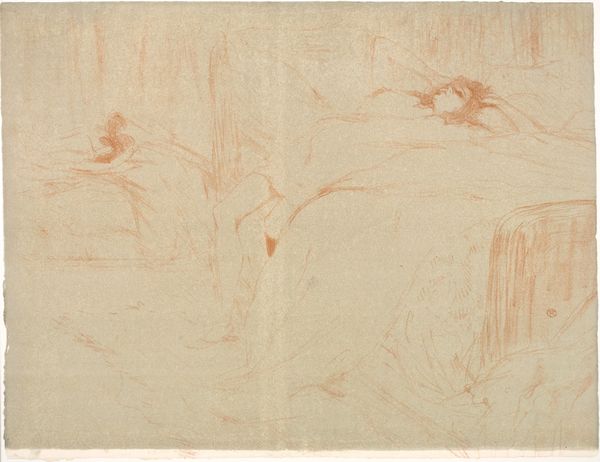 Editor: This is "Sleep," or "Le sommeil," by Henri de Toulouse-Lautrec, made around 1896. It’s a drawing or print on paper in a reddish-brown color. I’m struck by how delicate it looks; what can you tell me about it? Curator: Considering this drawing from a materialist perspective means understanding the paper and pigment not just as neutral supports, but as active participants in constructing meaning. How does the ready availability of mass-produced paper, for instance, democratize art making, shifting it away from the elite patronage system? Editor: That's a very different approach. I hadn't really thought about where the materials come from. So the kind of paper used could change the interpretation of the piece? Curator: Absolutely! Toulouse-Lautrec was not simply depicting a scene but engaging with the very means of production. Consider how the texture of the paper informs the overall aesthetic – does it lend a certain rawness or intimacy? How might that reflect the lives of the working class figures he frequently portrayed? The quickness of the lines—was that also due to mass production allowing more attempts, more sketches? Editor: I see your point! Looking at it that way, I see how the mass-produced material gives him the ability to use more lines without making a "precious" artwork. That really shifts the meaning. So the act of sketching becomes important itself. Curator: Precisely! We see the artistic process exposed, the means by which this image came to be. What can we deduce about the artist's labor from this drawing? Was this for mass consumption or more 'high art'? Editor: I guess that the meaning and implications can change based on understanding the materials. It definitely gave me a new way of looking at "Sleep". Thanks! Curator: My pleasure! Always consider the physical reality that the art came from – labor, cost, and what all that implies!