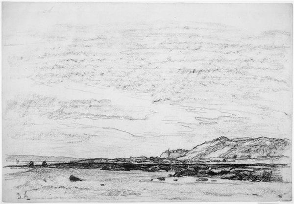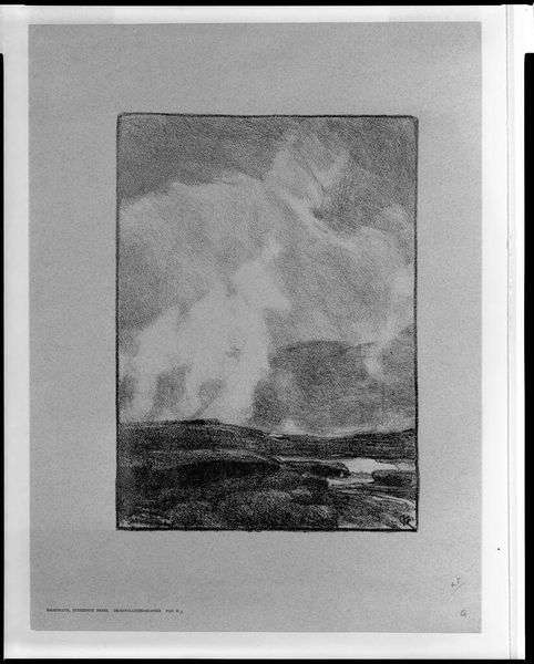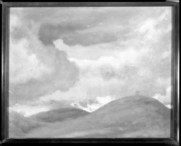 Editor: This is Arthur Mayger Hind's watercolor, "Landscape." The muted tones and vast sky evoke a feeling of solitude. What symbols or cultural memories resonate with you in this piece? Curator: Notice how the heavy clouds dominate the composition. Clouds, throughout art history, often symbolize transition, the ephemeral nature of existence, or even divine presence. Does this rendering suggest a specific emotional weight? Editor: Perhaps a sense of melancholy, given the monochrome palette. Curator: Indeed. Consider also how landscape itself functions as a symbol. Is it idealized, or does it reflect a particular cultural understanding of nature? How does this landscape echo collective memories? Editor: I hadn't considered the weight of the clouds or the symbolism inherent in the landscape itself. Curator: Exactly. Even seemingly simple depictions can carry profound cultural and psychological significance.