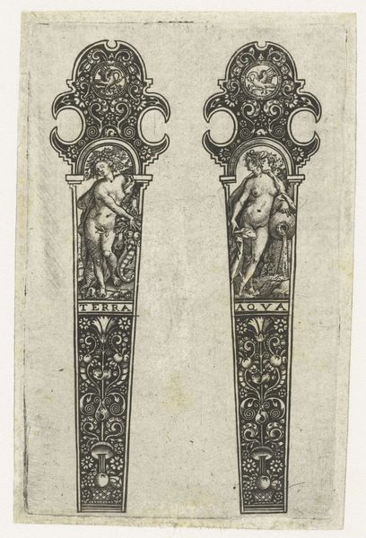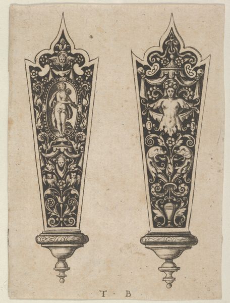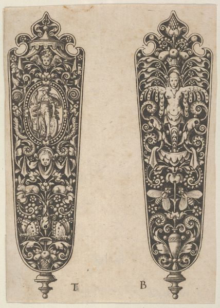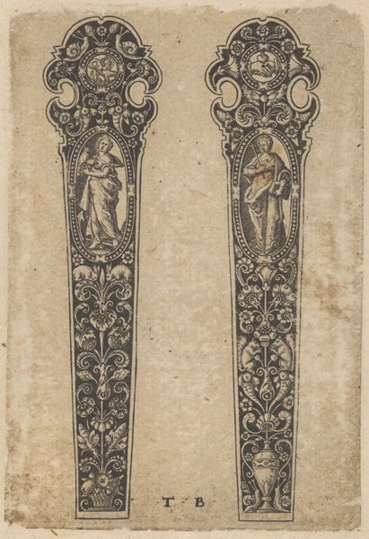 This drawing by Johann Theodor de Bry presents designs for knife handles, steeped in symbols of morality and mortality. On one, we see Adam and Eve succumbing to temptation, an image that echoes across centuries, from medieval tapestries to Renaissance paintings. This scene isn't just a biblical story; it’s a potent reminder of human fallibility, a theme that resurfaces in various guises throughout art history. The *memento mori* scene on the other knife handle reminds us of the ephemerality of earthly life, similar to vanitas paintings that flourished in the Dutch Golden Age. Consider how the skull, a universal symbol of death, appears in countless forms, from ancient Roman mosaics to contemporary art installations. Each iteration reflects a culture's attempt to grapple with mortality. These images tap into a deep, subconscious awareness of our own mortality, engaging viewers on a primal level. The cyclical progression of these symbols demonstrates their enduring relevance. The themes of temptation, sin, and mortality aren't confined to any single era. They resurface, evolve, and take on new meanings in different historical contexts, showing us the threads of cultural memory that weave through the fabric of art.