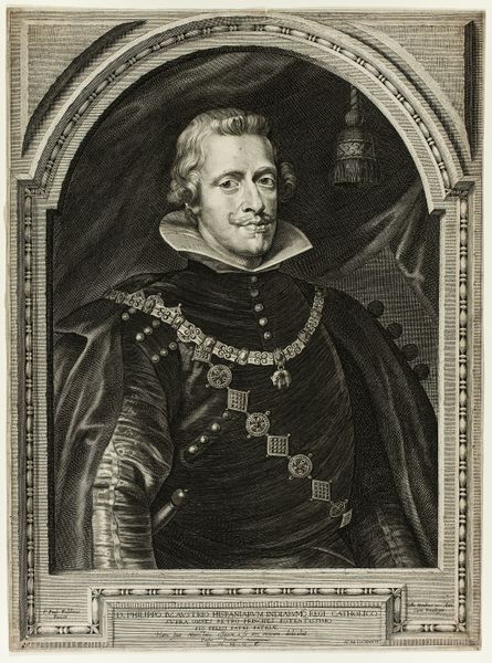 This is an engraving of Philip IV, King of Spain, made by an anonymous artist. During Philip's reign, Spain saw both its Golden Age of art and literature, and immense political decline. This portrait captures something of that tension, the king adorned in the finery of court, yet with an expression that hints at the weight of his crown. Consider how the image subtly communicates power and authority. The use of line and shadow in the engraving not only captures the physical likeness of Philip IV, but also conveys aspects of his character and the complex historical moment in which he reigned. The decision to portray him within an oval frame, a common motif for portraits of nobility, further emphasizes his status. The inscription at the bottom dedicates the work to Philip, son of the fatherland. How might it have shaped the viewers perception of the King and his reign?