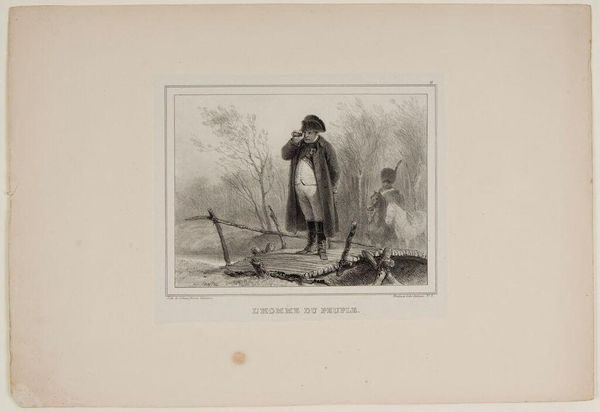 Editor: This is Auguste Raffet's "I want him t' hit me! 'E's my husband!". It's a print, and it really captures a chaotic, almost desperate energy. What symbols or deeper meanings do you see in this piece? Curator: The image pulses with societal anxieties, doesn't it? Notice the central couple - their embrace, or rather, her clinging to him. It is a distorted reflection of power dynamics, a warped expression of cultural scripts around love and ownership. What does that say about the psychological landscape of the time? Editor: So, the act of violence becomes almost a twisted form of connection? Curator: Precisely! The surrounding figures amplify this. The bewildered observer, the indifferent drinkers – they represent a society complicit in these cycles. Raffet compels us to confront the uncomfortable truths embedded in our collective memory. Editor: I hadn't considered the complicity aspect. It's a lot darker than I initially thought. Curator: Art often holds up a mirror, reflecting back the shadows we'd rather ignore. The power of symbols lies in their ability to trigger those unsettling recognitions.