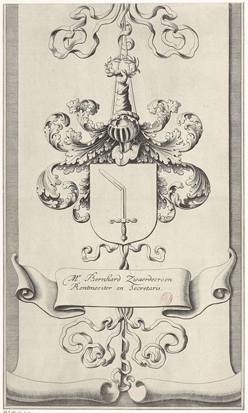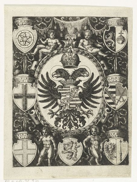 Curator: My first impression is of grandeur, the scale makes you think of tapestries rather than, say, printed ephemera. Editor: Indeed. This engraving, made in 1667 by Pieter Jansz., is entitled 'Design for glass window 10 donated by the Rijnland Water Board'. Curator: Water boards commissioning artworks? Immediately conjures questions about the politics of representation and the role of institutions in shaping collective identity. Was this a moment of establishing their power or trying to soften it? Editor: Considering the painstaking process, including the design transferred to glass and subsequent artisanal craftsmanship, one grasps the value and meaning placed on it. Curator: Right, and it really makes one think about labor. These commissions were more than just decoration—they were symbolic displays of resources, expertise, and artistic traditions—all the labor involved is striking. Editor: The iconographic elements speak volumes too. Allegory is very popular, you can notice angels surrounding a coat-of-arms, a symbol of power... Curator: It’s also worth acknowledging the tension between these allegorical symbols of dominance, like the eagle and the crown, and the underlying themes related to the Water Board’s existence. Whose lives were controlled in its name? Editor: These pieces served to underscore the Water Board's importance to trade and regional autonomy, all while representing its position through artistry. You're quite right to point to what isn't presented. Curator: Looking at the craftsmanship informs so much – a piece celebrating social hierarchies, a meditation on power and material production of the time. Editor: Precisely. By scrutinizing its context and construction, it offers a layered view of the era. Curator: Agreed, and thinking critically about the themes, how artistic value and symbolic power intersects provides much deeper insight. Editor: Well put, examining this through our differing approaches creates a wider historical understanding of the piece itself.