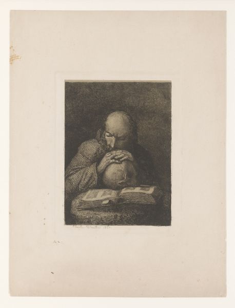 Curator: Allow me to draw your attention to a drawing titled "Stilleven met buste en schelp," or "Still Life with Bust and Shell," created sometime between 1888 and 1913. The artist worked in pencil on paper. You can find this intriguing artwork in the Rijksmuseum. Editor: The overriding sensation is melancholy. The monochrome lends a quietness, and even though it depicts everyday objects, it feels charged with hidden emotions. The artist's mark-making creates subtle gradations in tone and texture which feels deliberate and affecting. Curator: That's a keen observation. Notice the child's bust; there is a weight to it, despite its small size and the fact it's only stone. Consider its context. Child mortality was once devastatingly common, turning children into objects of mourning or remembrance. The surrounding objects, particularly the shell, symbolize birth, death, and rebirth in some cultures. Editor: True, and then the lines that compose the image, a symphony of directional strokes that render light and volume so effectively, add to this impression. I see the shell as a form exploring the relationship of exterior to interior space and wonder what informed its inclusion here. It seems chosen as carefully as the draped fabric that acts as a backdrop. Curator: The positioning of objects—the bust overlooking the shell, the glass vial catching the light, the implied narrative all lend weight to a cultural history and psychological portrait of loss and acceptance, presented in a muted tone as you said. Editor: Yes, that gentle sadness comes through. Looking at how line and shadow play against each other I wonder how the artist sought to convey permanence in this still life drawing—to memorialize what passes. I will think about this sketch for some time. Curator: Indeed, the dialogue it creates, across the ages, is striking.