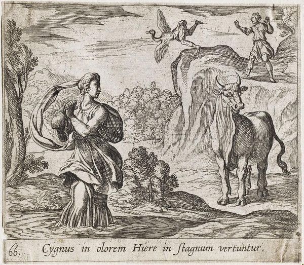 Editor: This is Plate 66: Cycnus and Hyrie from Ovid’s *Metamorphoses* by Antonio Tempesta, created in 1606. It's an engraving in ink. It strikes me as a rather busy composition. What catches your eye, looking at this artwork? Curator: I see a potent visual narrative deeply rooted in transformation and loss. Notice how Tempesta uses contrasting figures – the swan, the bull, the weeping woman. Consider the symbolic weight. Swans, even then, carried associations with transformation. They link to both Apollo and narratives of disguise and deception. Editor: So, you are saying these characters were all known symbols back then? Curator: Precisely! Think of the bull, often linked to power and virility, but also sacrifice. And the woman—Hyrie—becomes a lake of tears! This echoes ancient myths where grief transforms the body into natural features. Can you feel the weight of cultural memory being carried in these forms? Editor: It does create a sense of overwhelming sorrow and dread when you know all these stories. What do you make of the landscape itself? It feels… tumultuous, almost? Curator: It is! The setting reflects the inner turmoil. See the jagged rocks, the dense foliage? They’re not just decoration. They amplify the emotional charge of the scene, underscoring the characters' internal states. Tempesta brilliantly mirrors the metamorphic themes in the very environment. He masterfully weaves individual and environmental experiences. Editor: I see the connection now. I appreciate how the symbols compound the narrative! Curator: And remember, symbols evolve over time, taking on new meanings, so we need to be aware of these evolving references to really understand the visual and historical record. Editor: I learned that even familiar imagery can reveal deeper cultural stories. Thanks for broadening my perspective on art history.