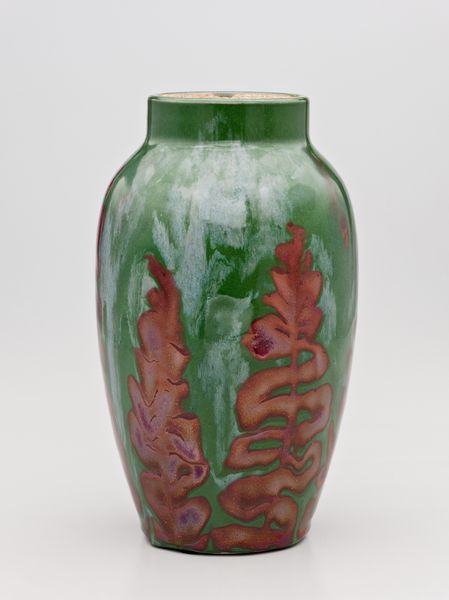 Editor: Standing here, you're immediately struck by the height of this ceramic vase. It was crafted around 1897 by Max Laeuger. I am intrigued by its shiny, almost iridescent green glaze and the organic forms intertwined on its surface. What is your take on the piece, formally speaking? Curator: Considering formal analysis, we can note how Laeuger manipulates texture. The glossy glaze serves to highlight, contrasting starkly with the matte, raised lines which form the decorative botanical and zoomorphic elements. These raised elements physically disrupt the otherwise flawless curvature of the vase, creating an intriguing tactile dimension. Observe how the application of color – the emerald gradients shifting to brown near the base and neck – works to articulate its shape. Editor: It's the color and texture, yes. I didn't quite register the intention of that before. Do you think there’s any interplay between the flatness of the stylized leaves and the roundness of the vase itself? Curator: Indeed. This juxtaposition is central to understanding its aesthetic strategy. Laeuger effectively exploits a tension between two-dimensional representation and three-dimensional form. The surface ornamentation functions simultaneously as surface design and integral component of the vase's structure. Furthermore, note how the design refrains from completely enveloping the form. Empty space becomes crucial, almost acting as a canvas, enhancing the visibility and thus the potency of the Art Nouveau design itself. Editor: That makes it feel more modern, somehow. Is it the asymmetry contributing to that too? Curator: Precisely. It's a subtle yet impactful asymmetry. The eye travels around it, never quite finding a stable, repetitive pattern. This calculated asymmetry further activates the visual plane, imbuing the object with dynamic, organic energy. These formal elements – glaze, relief, curvature, colour, negative space and calculated asymmetry – all coalesce. Editor: I never would have picked up on that subtle asymmetry. It's funny, how much closer you look once you understand what you’re supposed to be looking at.