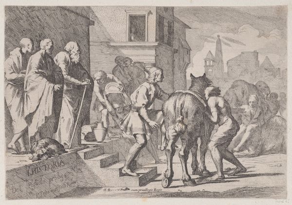 Curator: Welcome, everyone. We're looking at "The English Farrier, plate 10 from Various Subjects Drawn from Life on Stone" by Théodore Géricault, a lithograph from 1821, housed here at The Art Institute of Chicago. Editor: My first impression is how dramatically Géricault uses light and shadow. It creates such a moody, almost theatrical scene, wouldn't you say? Curator: Absolutely. But I find myself thinking about the social commentary. Look at the workers and the conditions of their labor— the farrier shoeing the horse, the ostler perhaps caring for another. Lithography, as a relatively accessible printmaking method, allowed for broader distribution of such images, depicting the lives of working people. Editor: That interplay of light and shadow does more than create atmosphere. It isolates forms, highlighting the muscular tension in the men, the powerful build of the horses. See how he contrasts the smooth planes of their bodies with the rough texture of the brickwork. Curator: And notice how Géricault is presenting the means of horse-keeping. It shows the behind-the-scenes labour required to keep horses – animals of labour and status - in service in this era. Editor: Indeed. There's a raw realism, yes, but it is masterfully composed. Observe the diagonal lines formed by the bodies leading your eye deeper into space; they give rhythm and compositional integrity, beyond mere record. The way he suggests depth through those carefully placed figures. It transcends simply depicting labour to being a very astute pictorial analysis. Curator: He's also using the relatively new medium of lithography to bring working-class trades to the attention of the public. This print is part of a series of everyday life representations and artistic exploration of labor, materiality, and, indeed, consumption. Editor: Ultimately, what grabs me about the piece is its sheer artistry—the dance between light and form, the carefully calibrated composition that makes the ordinary appear monumental. Curator: For me, it’s the insight into the lives of those providing the services. It encourages us to examine labor practices and the systems within which individuals toil, creating value. Editor: I agree; those tensions work so brilliantly here on paper to stir up such vivid ideas. Curator: A fascinating study.