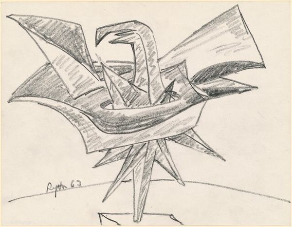 Editor: Here we have Seymour Lipton's "Untitled," a 1954 drawing rendered in graphite and ink. I find the sharp, dark form contrasted against the softer, almost swirling lines quite striking. What do you see in this piece? Curator: It's compelling, isn't it? Lipton was deeply engaged with the socio-political anxieties of the mid-20th century. Consider the Cold War, the rise of existentialism. Does this form, this almost weapon-like silhouette emerging from what seems like chaotic energy, resonate with those anxieties for you? How does this interplay of darkness and tentative creation speak to the human condition in times of unrest? Editor: I see what you mean! The 'weapon-like silhouette' definitely stands out. I hadn't considered the influence of the Cold War era on abstract art like this. Do you think Lipton was consciously commenting on political issues, or was it a more subconscious expression? Curator: It's a fascinating question. Abstract Expressionism, at its core, sought to explore universal themes through personal expression. But, can the personal ever truly be divorced from the political, especially during such a turbulent period? Lipton, like many artists of his generation, grappled with the ethical responsibility of the artist in a world hurtling towards potential self-destruction. Editor: That's such an interesting point – the ethical responsibility of the artist. So, this abstract form could be read as both a personal and a political statement? Curator: Precisely. It's about acknowledging the intersections between the inner world and the outer, social realities. Thinking about it in terms of intersectionality adds a new layer of depth to the piece, for me. Editor: I never considered approaching art in such a multi-layered way. Thanks for opening my eyes to it! Curator: My pleasure. There is so much more to explore in the fusion of art, identity, and historical narrative!
