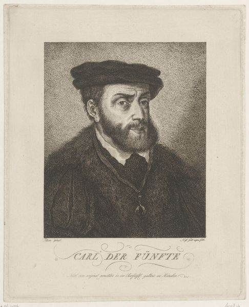 Editor: This is Carl Ernst Christoph Hess's engraving of "Charles V." I'm struck by the density of the marks, especially the way they define the texture of the beard and fur. What do you see in terms of technique? Curator: The tightly controlled hatching and cross-hatching are indeed remarkable. Note how the density shifts to create tonal variations, defining the form. The artist masterfully uses line alone to suggest volume and depth, focusing the eye on the subject’s gaze. Do you find the gaze engaging? Editor: Yes, it almost feels confrontational! I now understand the power of line to create more than just a likeness. Thanks! Curator: Indeed. The starkness of the black and white enhances the intensity, a testament to the power of formal elements.