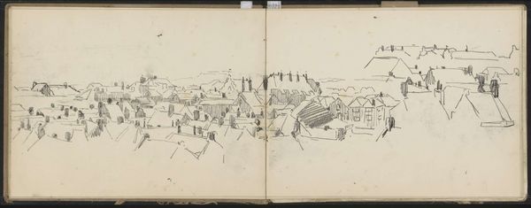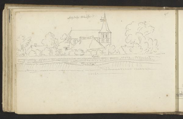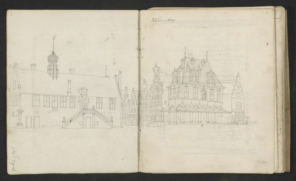 Editor: This is "Buitenplaats met ommuurde tuin," or "Country Estate with Walled Garden," a pen and ink drawing from around 1728-1732 by Cornelis Pronk, held here at the Rijksmuseum. It feels so precise and delicate, almost like a technical drawing, despite its rather personal sketchbook nature. How do you interpret the composition and lines within this drawing? Curator: The formal relationships established here are indeed quite interesting. Note how Pronk meticulously renders the architecture of the estate, employing precise linear perspective. The structure, symmetrical in its form, dominates the middle ground, creating a focal point. Editor: Yes, the symmetry is very striking. But I'm also curious about the relationship between the cultivated garden and the suggestion of a wilder landscape beyond. Curator: Precisely. Consider the tension between the manicured garden, rendered with detail, and the looser, more gestural depiction of the trees and foliage in the background. This contrast creates a visual dialectic between order and nature. The formal arrangement invites further interpretation using structuralist approaches. Editor: A dialectic between order and nature, that's helpful to see! It also prompts questions about the artist's choices, his gaze and interests… Curator: One may inquire into Pronk's selection of the linear medium, enabling sharp edges and clean geometries, emphasizing rationality and structure. How do the contrasting pen strokes guide the viewer’s eyes throughout the depicted terrain? Editor: It seems every line is carefully considered and deliberately placed, achieving a formal harmony overall, which certainly conveys that ordered vision. Thanks so much! Curator: Indeed. By closely observing the composition, forms, and lines within Pronk’s drawing, a new perspective on aesthetic and representation arises. Thank you.