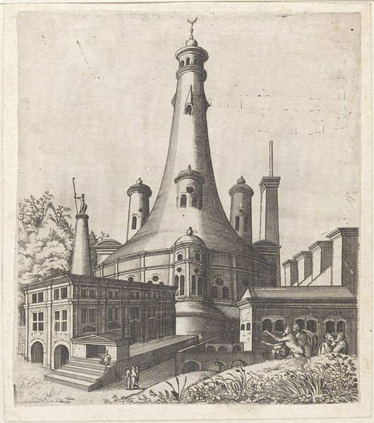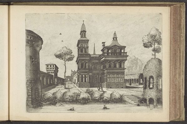 This is "View of a Moated Castle" by Johannes or Lucas van Doetechum, an engraving of modest size. The meticulous lines carve out an elaborate architectural fantasy, drawing us into a world that balances precisions with dreamlike qualities. Notice the imposing structure, its form rendered with remarkable clarity, flanked by smaller buildings that give it scale. The use of line—sparse in the sky and dense in the architecture—creates contrast and depth. The castle's reflection in the water adds a layer of symmetry, playing with perception and reality. Within the semiotic framework, the castle stands as a signifier of power, while the surrounding nature offers a contrasting symbol of serenity. These elements, meticulously arranged, suggest a dialogue between human ambition and natural harmony. It's a statement on space, representation, and the interplay of cultural codes in defining our understanding of the world. This engraving invites us to consider how such calculated arrangements challenge and expand our understanding of visual and philosophical possibilities.