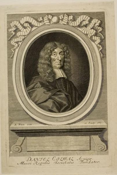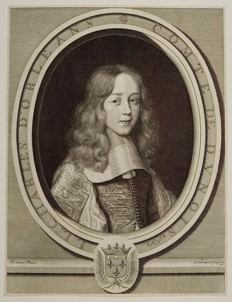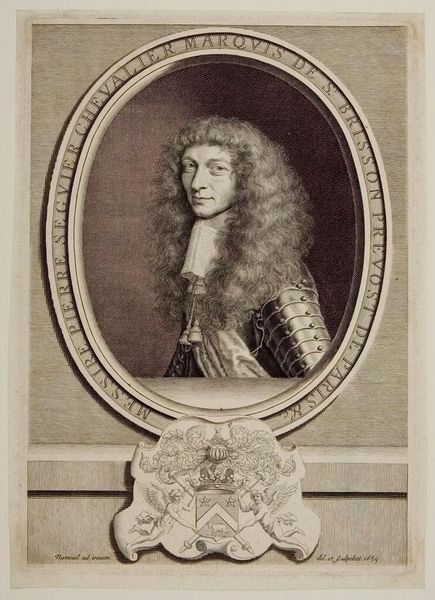Curator: Pieter van Schuppen, born in 1627, presents us with his portrait of Pierre Ignace de Braux, Baron de Champagne. Editor: Immediately, I’m struck by the elaborate frame – almost like a garland of delicate foliage holding him in place. Curator: Indeed, the ornate frame adds a layer of formality. Schuppen was known for his skill in engraving, and his attention to detail conveys the Baron’s status and sophistication. Editor: It is an interesting contrast; the wild hair feels almost rebellious against the rigidity of the printed medium, and his subtle smirk hints at self-awareness, even humor. Curator: The portrait, beyond being a representation of an individual, offers insight into the values of the 17th century, particularly the importance of lineage and social standing. Editor: Absolutely, and there is an echo of melancholy there. Like a fleeting glimpse of humanity carefully crafted within an official depiction.