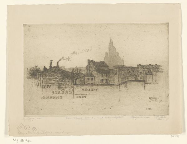 Editor: Here we have "Monnickendam, gezien vanaf de toren van de Grote Kerk," an etching made between 1899 and 1913 by Wijnand Otto Jan Nieuwenkamp. It's such a detailed cityscape; the perspective almost makes you feel like you're looking down upon a miniature world. What draws your eye when you look at this piece? Curator: Immediately, it is the organizational principle—the aerial perspective. It allows the artist to play with patterns of light and shadow, meticulously articulated across the roofs and fields. Note the repetition of forms—the triangular roofs, the vertical tree trunks—how they contribute to the overall harmony of the composition. It's almost a study in geometric abstraction, wouldn't you agree? Editor: I can see that. It’s definitely more ordered than I first perceived. The textures also add complexity. Curator: Precisely! The textures are crucial. Look at the differentiation between the smooth expanse of water and the heavily worked areas of the town itself. Nieuwenkamp has carefully orchestrated these textural contrasts, using the etching technique to evoke a sense of depth and atmosphere. He isn't just depicting a city; he's crafting a visual experience. Notice, for instance, how the details fade into softer tones as they recede into the distance, further enhancing the illusion of space. Editor: So, you are focusing more on the structure than, say, what the image says about Dutch life at the time? Curator: Indeed. My emphasis is on understanding how the artwork operates as a self-contained visual system. It invites an exploration of the artist’s choices regarding form and technique, rather than its social or historical implications. Editor: I never considered approaching a landscape that way. I’m always thinking of subject matter. Curator: Exploring how an artwork generates meaning through its formal properties can open up entirely new avenues of appreciation. Perhaps even unlock further exploration. Editor: Thanks! That's given me a lot to think about.
