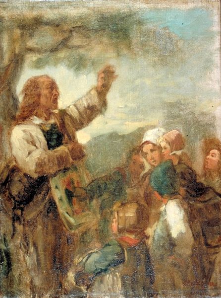 Ary Scheffer’s oil painting, "Quatre soldats de l’armée en déroute", presents a stark depiction of military defeat through its composition and use of color. The somber palette, dominated by muted browns, grays, and whites, evokes a sense of despair, mirroring the soldiers' plight. Scheffer employs a pyramidal composition, grounding the figures in their shared suffering, while the dynamic, diagonal lines created by their postures suggest instability. The brushwork, loose and expressive, adds to the emotional intensity. Scheffer’s decision to focus on the defeated rather than the heroic aligns with a broader shift in 19th-century art towards realism and a critical examination of social themes. Ultimately, it invites reflection on the human cost of conflict. Rather than presenting a singular interpretation, it serves as a powerful visual statement that resonates with ongoing debates about the representation of war.