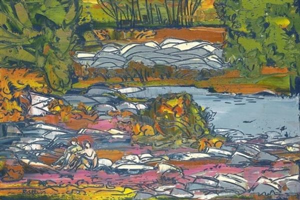 Editor: So, this is J.E.H. MacDonald’s "The Little Falls Sketch," painted in 1918. The heavy impasto and bright colours give it an almost tactile quality, like I could reach out and feel the rocks and rushing water. How would you interpret this landscape? Curator: This piece reflects the rising national consciousness in Canada following World War I. Artists like MacDonald sought to define a distinctly Canadian identity, turning to the land itself for inspiration. MacDonald painted “en plein air," capturing the raw energy of the natural landscape directly onto the canvas. How do you see that connection to Canadian identity expressed here? Editor: Well, it feels very different from the European landscapes I’m used to. It's less about manicured gardens and more about rugged, untamed nature. The sketch conveys a sense of place, and also almost spiritual reverence, right? Curator: Exactly. Think about the socio-political context. Urban centers were growing, but artists also wanted to assert Canada’s independence from Europe by embracing its wilderness. Consider the role the Group of Seven played in shaping this nationalist imagery. How do you think that larger art movement impacted MacDonald's individual approach? Editor: Knowing it’s part of that bigger movement makes me see it differently. It is more than just a pretty picture. It's a statement about what Canada *is*, at least ideally. Curator: Yes. Its public reception played a key role in crafting and negotiating cultural values. Its impact still resonates in shaping how Canadian landscapes are understood and promoted today. This dialogue invites reflection on historical context, nationalist movements, and lasting cultural influences. Editor: Absolutely. Looking at it now, I understand the cultural significance much more. The "Little Falls Sketch" has become even more interesting than I first thought.