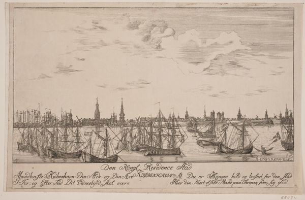 Editor: This etching, “Det nye værft på Christianshavn” from 1743 by C. Vosbein, gives a detailed view of the new dockyards. What strikes me is how it almost seems like a promotional image, highlighting the industrial capacity and maritime power. What stands out to you about this print? Curator: Notice how the etching foregrounds not just the completed ships but also the infrastructure and processes necessary for their construction. See the scale of these ships juxtaposed to that of the laborers and carpenters working with them. This emphasizes the labor embedded in the creation of these maritime vessels. This etching elevates craft and industry, suggesting that the means of production—the docks, the tools, the manpower—are themselves worthy of artistic representation. Why do you think it’s rendered in such detail? Editor: I see your point about labor! I suppose that in a world before photography, such minute detailing was vital for accurately communicating information, highlighting precision, celebrating mercantile expansion, or simply capturing reality. Could we also view the material limitations of the printing process—etching on metal—as intrinsically linked to the work’s aesthetic? Curator: Exactly! The conscious decision to render such a sprawling scene with etching and engraving is particularly relevant. This technique lends itself to capturing the industrial prowess celebrated in the image. The crisp lines and ability to create fine detail made the ships look modern and orderly, as if trying to represent industry as pristine rather than dirty or disorganized. How might consumerism play a role in interpreting this landscape? Editor: Hmmm...perhaps these highly detailed, readily reproducible prints democratized art. Maybe their production invited people to invest, buy, or feel a sense of local pride? I guess art can play more than one role at a time! Curator: Precisely. The materials and techniques of this etching are inextricably tied to its content and its socio-economic function. What might seem at first glance like a simple cityscape actually opens up complex discussions about labor, industry, and the very nature of art itself. Editor: Fascinating. I'll never look at historical prints the same way again.