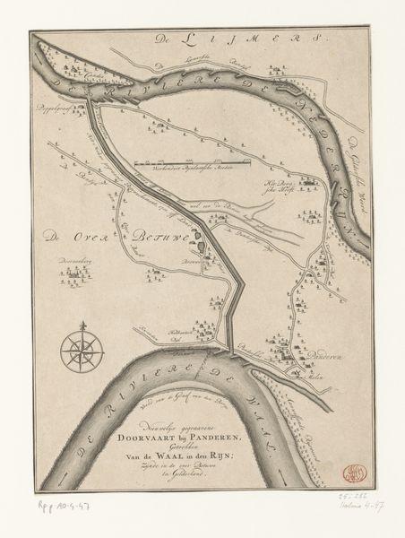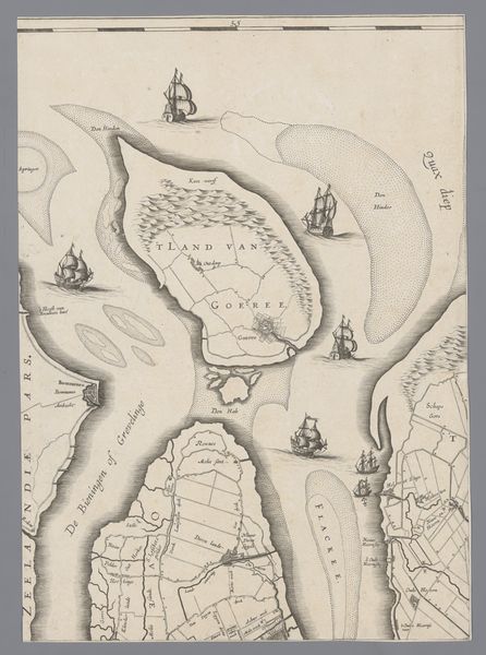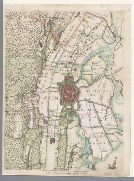 Curator: This map just whispers adventure, doesn’t it? So detailed and whimsical! It is titled "Deel van een kaart van Rijnland, met Amsterdam en omgeving", or "Part of a map of Rhineland, with Amsterdam and surroundings" dating back to 1615. The artist here is Floris Balthasarsz van Berckenrode. It’s ink on paper, residing right here in the Rijksmuseum. What leaps out at you? Editor: Right away, the careful division between the land and the water—it feels like a commentary on spatial power. Each carefully marked plot becomes a statement. Maps weren’t just geographical aids. They were tools of colonialism, ownership, and the consolidation of capital. Curator: Absolutely. Maps are so much more than just representations of places; they're stories in themselves. Look at Amsterdam so vividly colored in! All that red against the beige. Do you think it signifies vitality, the heart of the region? Editor: The red definitely emphasizes Amsterdam's importance. But the rendering also brings forth a critical viewpoint. The control of territory and resources, the marking of boundaries - who benefited from that control, and at whose expense? Think of the people displaced or whose claims were erased in service of "progress". Curator: Yes, there’s the beautiful and the unsettling woven together here. See the ships dotted around, braving the waters? I like how they look so precarious against the immensity of it all. They add a sort of dramatic flair to what might otherwise be a very academic landscape. Editor: Right. It’s a powerful reminder that our present is rooted in complicated pasts, which continue to impact who has access to resources, power, and visibility today. Curator: Indeed. Even through its aesthetic charm, the map prods us. Thank you for your thoughtful insights! Editor: It makes one wonder who these landscapes truly belong to.