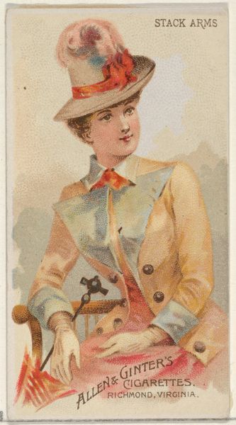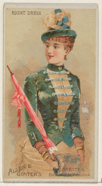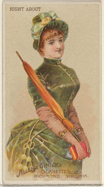 This is “Carry Arms,” a chromolithograph trading card made by Allen & Ginter, a cigarette company based in Richmond, Virginia. It's one of a series called “Parasol Drills,” depicting women in elaborate outfits, each holding a parasol in a different position, as if performing a military drill. The printing process is key to understanding this image. Chromolithography allowed for the mass production of colorful images. This vastly increased accessibility created a boom in advertising, especially for consumer products like cigarettes. Look at the detail – the texture of the woman’s velvet jacket, the frills on her hat, the way the light hits her parasol. All of this was painstakingly rendered by skilled engravers, who would have transferred the artist’s design onto multiple lithographic stones, each representing a different color. The very existence of this card speaks to the power of industrial capitalism. It was created to promote a product, using a process that itself depended on mass production and distribution. So, while the image itself might seem like a simple, charming portrait, it's actually deeply embedded in the social and economic context of its time.