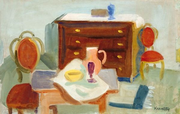 Kmetty János painted this "Still Life" using oil on canvas, and though we don't know the date, it evokes a sense of the past through its materials and subject matter. Oil paint, itself a slow-drying medium, encourages a deliberate, layered approach. János's visible brushstrokes create texture, giving a tactile sense of the objects, almost like we could reach out and touch the glazed ceramic of the blue teapot or the rough weave of the curtain. The choice of everyday objects – fruit, dishes, a simple table – speaks to a focus on the beauty of the mundane, not unlike craft traditions that elevate function to art. The labour is evident in the application of paint, each stroke a conscious decision, building up to a cohesive image. By paying close attention to the material qualities and the process of creation, we appreciate how János imbues his painting with cultural significance, blurring the lines between fine art and the humble objects that enrich daily life.