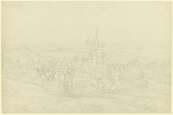 Curator: Welcome. We are standing before an intriguing drawing here at the Städel Museum, a pencil on paper work entitled "Bergfeste auf bewaldetem Gipfel" by Peter Becker. It translates roughly to "Mountain Fortress on a Wooded Peak". Editor: My first impression is of a fragile dreamscape. The soft pencil lines create a sense of ethereal detachment, as if this mountain fortress exists more in the realm of imagination than reality. You can almost feel the tooth of the paper coming through. Curator: Indeed. Consider the architectural symbols— the towering spires, fortified walls, seemingly impenetrable from a distance. This reflects a deep, enduring human aspiration for security, stability, permanence. The mountain itself is an archetypal symbol of strength. Editor: Yet it’s all rendered so delicately! The labor behind creating a stronghold in reality would involve vastly different materials than humble pencil. I wonder what led Becker to choose this medium, it’s almost like rendering a monumental undertaking into something very temporary. Curator: Perhaps Becker wanted to hint at the fleeting nature of even the most formidable human creations. While the fortress embodies permanence, the soft, easily erased pencil speaks to impermanence. A castle in the sky… or at least a castle lightly sketched upon paper. Also note how nature is gently reclaiming the landscape at the edges. Editor: Right. Looking at the line work up close I notice areas where Becker applied variable pressure to achieve greater value, and the directionality of the lines follows the planes of the hill and architecture in a very specific manner. It clearly suggests not just the shape, but something about the way light and shadow create form. Curator: The symbol of light versus darkness—representing knowledge, safety—it contrasts nicely with nature which is always somewhat beyond our full understanding or control. Editor: Yes, a constant give and take with the wild! And by grounding a castle on a wooded peak through humble means— graphite applied with muscle memory and care— the drawing provides insight into a tension between construction, production, symbolism. I have such a clearer sense now for both! Curator: Me too, examining this piece offers, for me, a lens through which to view humanity’s perennial quest for a solid foundation, and the dream, always, of security. Editor: Exactly! A beautiful study in contrast that's very worth investigating closely, especially if one wishes to understand something about production, culture, and art-making!