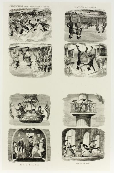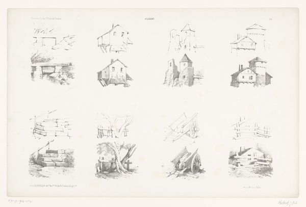 This print, titled *Eene party biljart*, presents a whimsical scene made using etching, a printmaking technique that relies on the corrosive properties of acid. The artist, A. Hölzgen, has created twelve vignettes of anthropomorphic insects engaged in a game of billiards. The fine lines, achieved by drawing through a waxy ground on a metal plate before immersing it in acid, give the figures a delicate yet detailed appearance. The acid bites into the exposed lines, which are then inked and printed. Looking closely, the use of hatching and cross-hatching creates depth and shadow, lending a sense of realism to the absurd scenario. The detailed rendering of the insects' exoskeletons contrasts with the smooth surfaces of the billiard table and cues. The choice of printmaking as a medium democratizes art, making it accessible to a wider audience. The labor-intensive process of etching is removed from traditional high art, inviting us to consider the skilled labor that goes into its creation.
